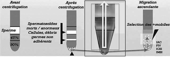 Les couches de densités différentes retiennent tous les éléments dont la densité est inférieure à celle de la couche traversée par centrifugation (cellules, débris, germes) et laissent passer uniquement les éléments de forte densité (spermatozoïdes).