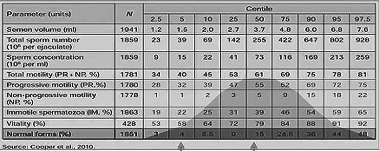 Il est important de noter que, d’une part, la valeur du 5e percentile pour cette population montre, par définition, que quelques hommes fertiles (5 % de la population choisie selon les critères ci-dessus) peuvent avoir des valeurs inférieures à ces seuils.