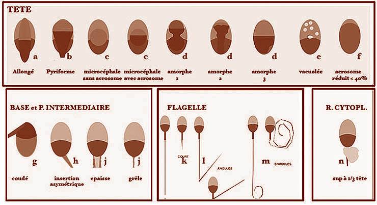 Leur analyse permet de déclarer toutes les anomalies dans chaque classe, mais généralement on ne déclare qu’une anomalie par classe ce qui est en accord avec la détermination du TZI (TeratoZoospermia Index) dont le calcul impose la prise en compte d’une seule anomalie par classe (Menkveld et Kruger, 1996 – Menkveld et Coll, 2001).