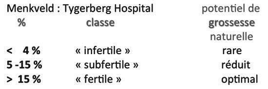 D’autre part, selon Kruger et Coll. Un meilleur pronostic est obtenu quand le taux de spermatozoïdes normaux est supérieur à 15 %.