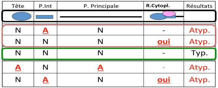 – Anomalies de la piece principale (flagelle) (P pour principal piece defects)