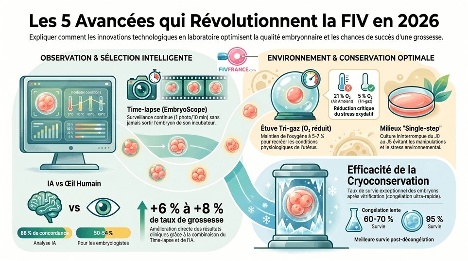 Le laboratoire d’embryologie est le cœur invisible d’un centre de FIV. Pendant les 5 à 6 jours que dure la culture embryonnaire, les embryons se développent dans des conditions qui imitent — aussi fidèlement que possible — celles de la trompe et de l’utérus maternel. Les avancées technologiques de ces dernières années ont permis de progresser sur deux fronts simultanés : créer des conditions de culture toujours plus physiologiques, et sélectionner avec toujours plus de précision les embryons présentant le plus fort potentiel d’implantation. Résultat : moins de transferts pour arriver à une naissance, et des embryons mieux préservés.