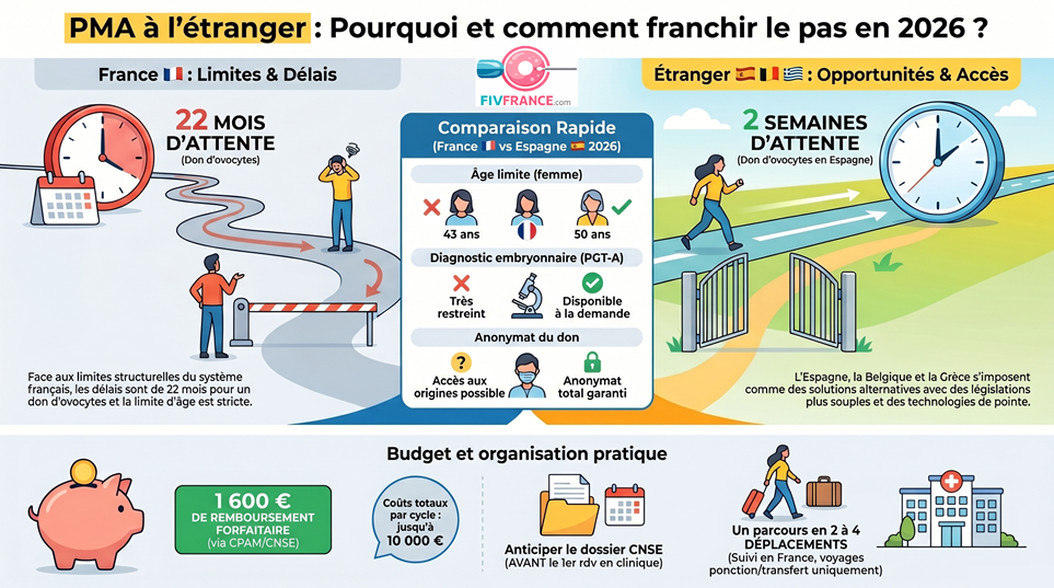 Chaque année, des milliers de Françaises franchissent la frontière pour réaliser leur projet parental — essentiellement vers l’Espagne, mais aussi vers la Belgique, la Grèce ou le Danemark. Ce n’est pas un choix de confort ou d’opportunisme : c’est souvent la seule solution réaliste face aux délais d’attente de deux ans pour un don d’ovocytes en France, aux restrictions d’âge légales, ou à l’impossibilité d’accéder à certaines techniques — dont le bilan chromosomique des embryons (DPI/PGT-A) — en dehors de quelques indications médicales très strictes. Cet article présente les raisons objectives, les destinations, les coûts et les démarches pratiques pour préparer une PMA à l’étranger en 2026.