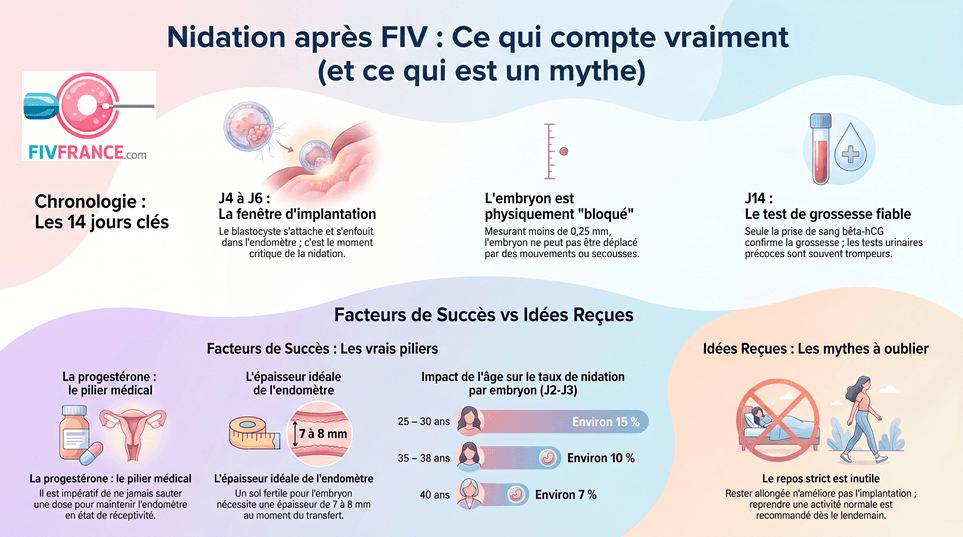 💡 Le succès de la nidation est joué avant le transfert. Si l’embryon est capable de s’implanter, il le fera quelles que soient vos activités après le transfert. Les facteurs déterminants sont la qualité embryonnaire et la réceptivité de l’endomètre — pas le repos, les secousses ou les déplacements.