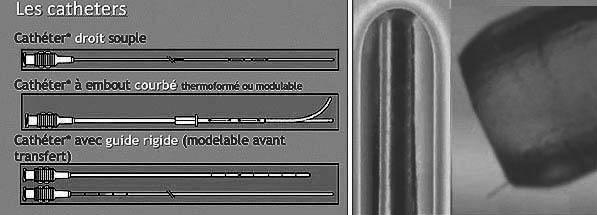 On pourra utiliser des cathéters souples ou armés qui pourront être travaillés au dernier moment en induisant une courbure de son extrémité (mémoire de forme). l’extrémité du cathéter devra être la moins traumatisante possible.