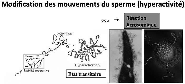 1 – une transformation des caractéristiques du mouvement des spermatozoïdes, en une forme de mouvement caractérisé par une forte amplitude, qu’on appelle » hyperactivation « 2 – la fixation et la pénétration de la zone pellucide de l’ovocyte